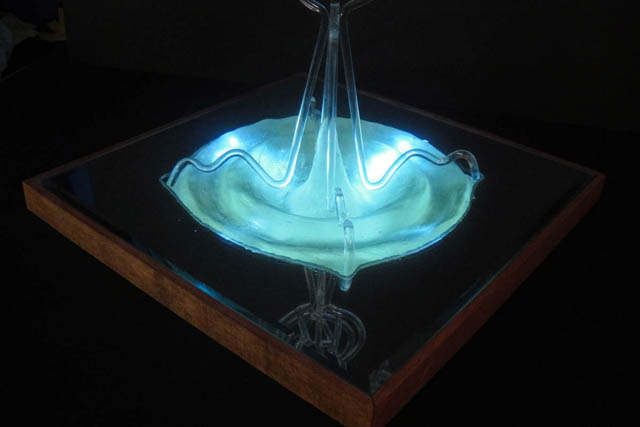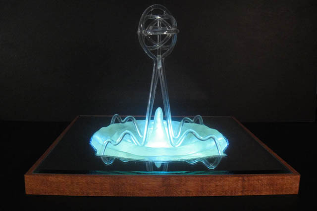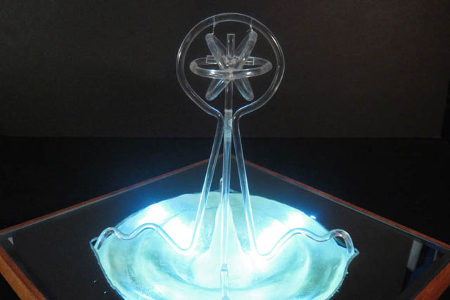 A "water drop" and central cross, at the instant just after a droplet hits a still body of water.